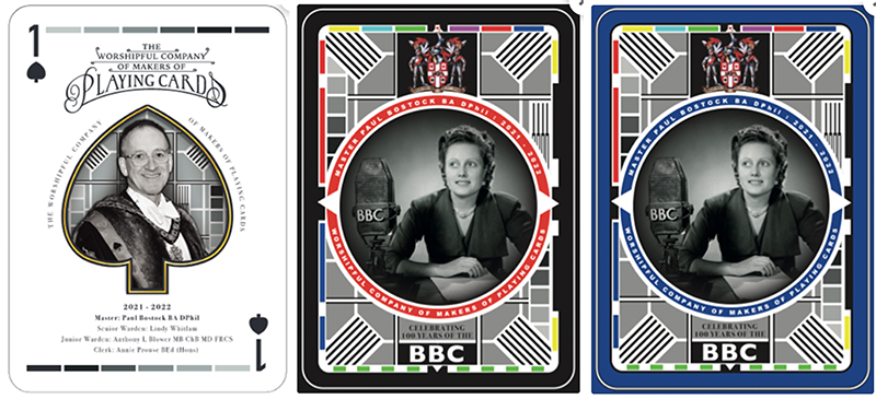 We are delighted with Stacey Kelly's lively portraits of BBC personalities. In addition we have given this set of cards some special features. There are some asymmetric court cards (those with different portraits at each end, like French and Saunders), and gentle modification of a few pip cards in set 2. As well as the Morecombe and Wise jokers, the extras include basic magician's gaff cards (the ones with two backs and the back design with the Master's portrait).